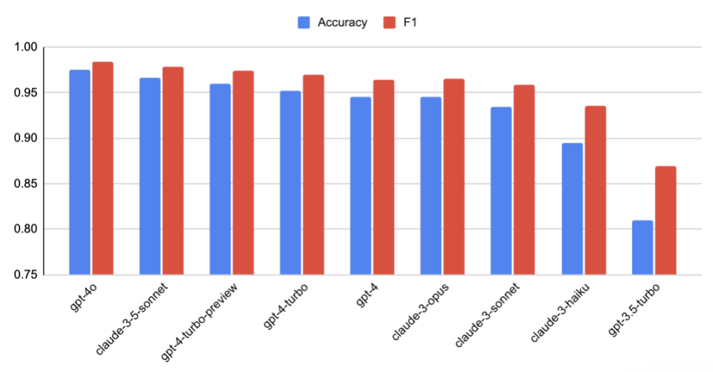We can also compare performance across foundational LLMs. Keeping everything else constant, we see a range of accuracy across popular commercial LLMs: