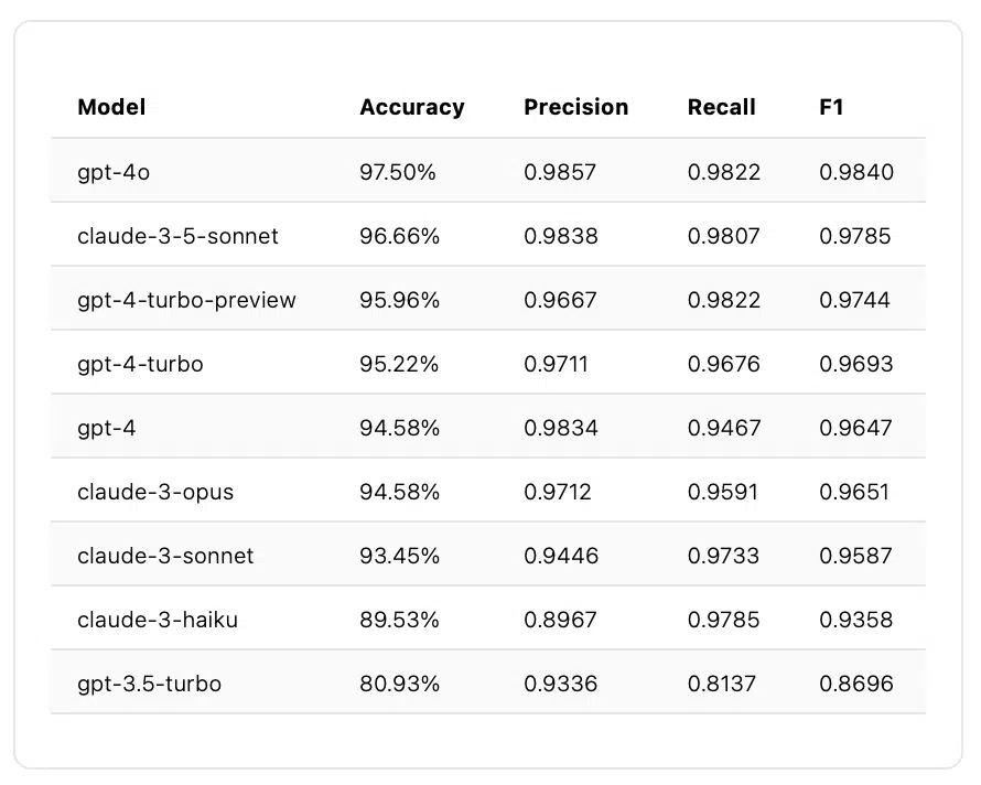 - The Anthropic Claude 3 family of models underperforms OpenAI’s flagship models. Additionally, successfully completing the tasks being evaluated in this report required some additional meta-prompt engineering to enforce JSON output for Claude 3 models.