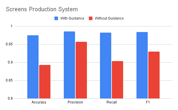 On the test set described in this report, Screen’s production AI system (built on top of commercial LLMs) produced the following results: